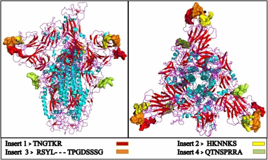 Sars-CoV2 und vier eingefügte Gen-Sequenzen im Spikeprotein