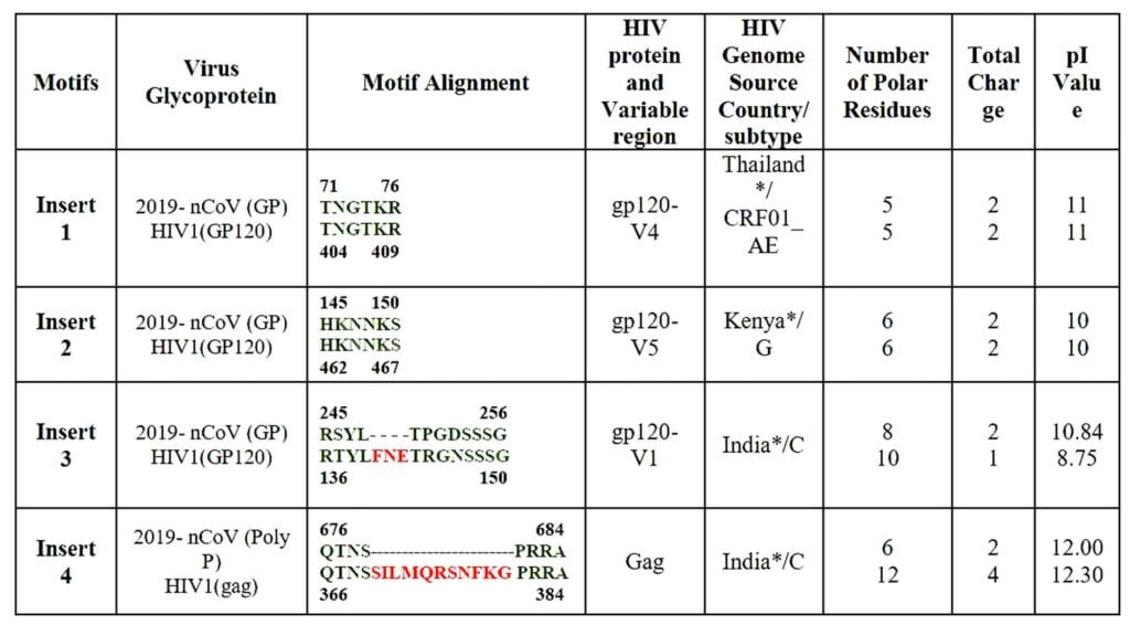 Zusätzlich haben die Forscher festgestellt, dass zwei der vier Aminosäuresequenz-Einfügungen („Inserts“) exakt übereinstimmen mit Sequenzen aus dem HI-Virus und die zwei weiteren sehr eng verwandt sind mit Sequenzen aus dem HIV-Spike-Protein („GP120“) (siehe Abb.2), das seinerseits die Infektion einer Wirtszelle mit HIV ermöglicht. Sie haben richtig gelesen. Gemeint ist hier tatsächlich das Virus, das das Krankheitsbild AIDS auslöst.