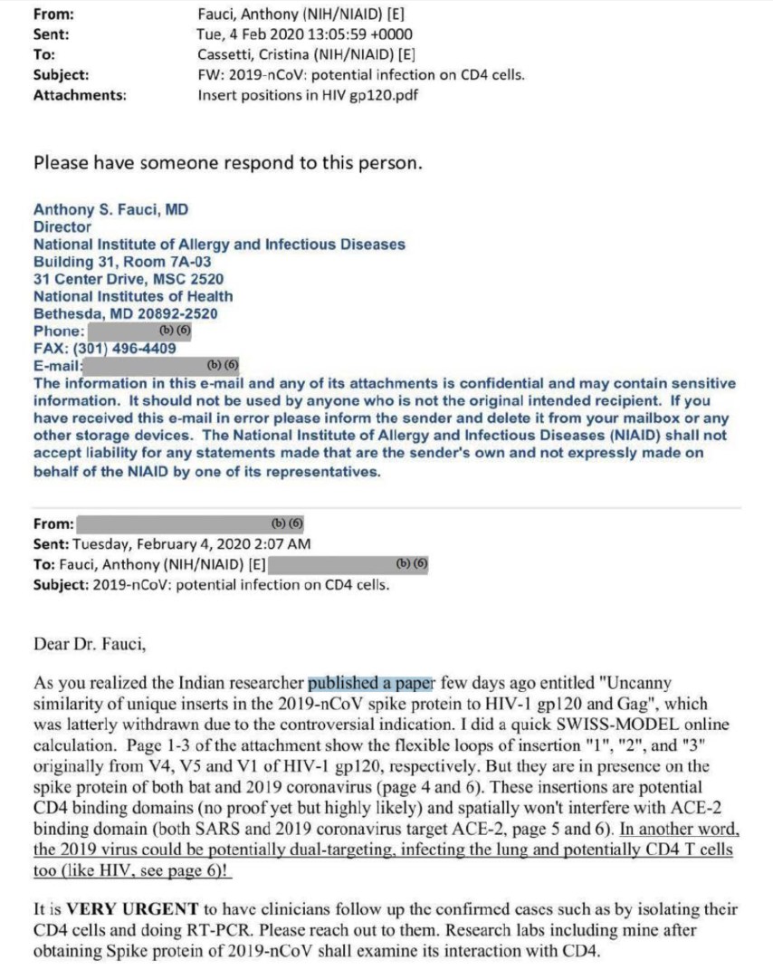 Abb.3: Kopie einer Email an Dr. Fauci vom 4. Februar 2020, die über das Informationsfreiheitsgesetz neben 3200 anderer Emails freigegeben werden musste. (15)
